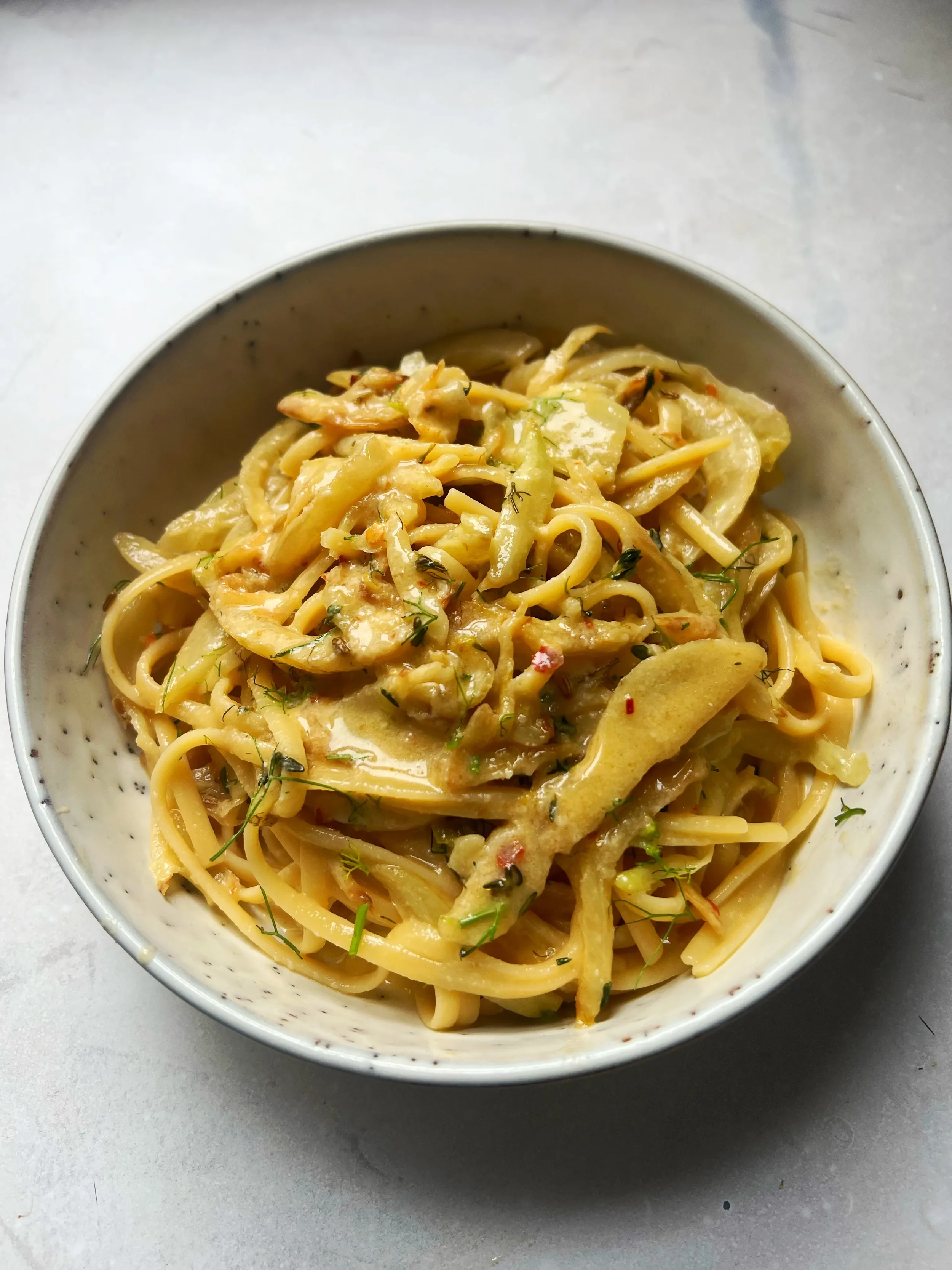 3. Add the linguine to the fennel pan and turn off the heat. Stir in the parmesan and lemon juice. Stir vigorously until a silky sauce has formed, adding pasta water as necessary.